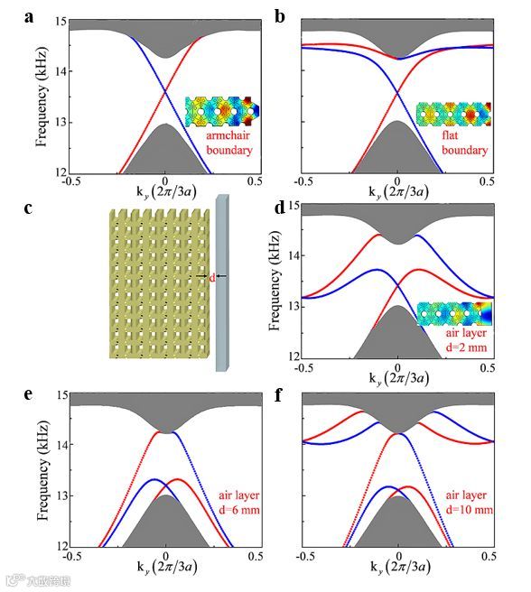 非闭合的表面态费米弧是外尔半金属的重要特征。我们发现,表面态的色散极易受到表面环境的影响,通过改变表面的几何结构或者在样品表面引入空气层能够有效的对表面态进行调控,但同时表面态仍然保持无带隙特征,即拓扑性质没有发生改变。由图3a和3b可以看出,不同的表面几何结构会导致不同的表面态色散,我们进一步发现,在平整表面引入空气层后,随着空气层厚度的增加,由于空气层内波导模式与表面态模式的耦合作用,会导致表面态受到向下的“挤压”,从而提供了一种有效调控表面态色散的方式。