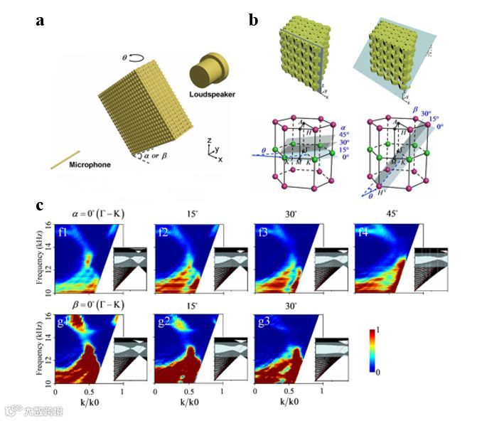 对样品进行角分辨透射谱测量,我们可以得到声子晶体的投影体能带,测量装置如图2a所示,通过旋转样品可以调整入射平面波的入射角度。我们利用3D打印制作了两种不同切面的样品,用来分别测量K点和H点的具有相反手性的外尔点,如图2b所示。测量得到的投影体能带验证了外尔点的线性简并特性,并且,当波矢远离外尔点时,可以观察到简并点的打开,见图2c。