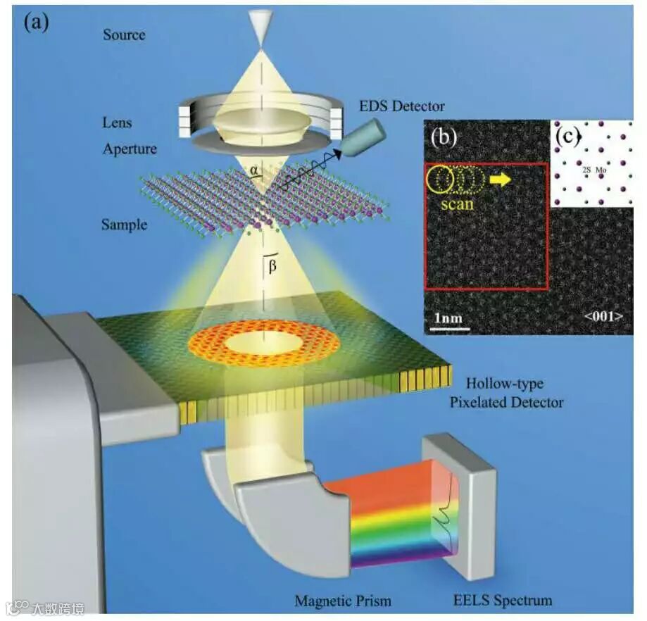 图1(a)光路原理示意图;(b)[001]方向二硫化钼的高角环形暗场电镜图像;(c)[001]方向二硫化钼原子模型图。