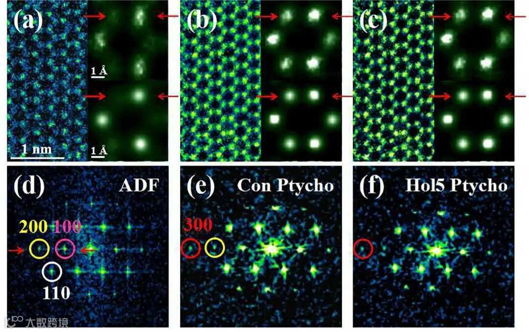 图2(a)环形暗场像(ADF);(b)传统叠层重构的相位像;(c)中空衍射图案叠层重构的相位像;(d)-(f)对应的傅里叶变换结果。