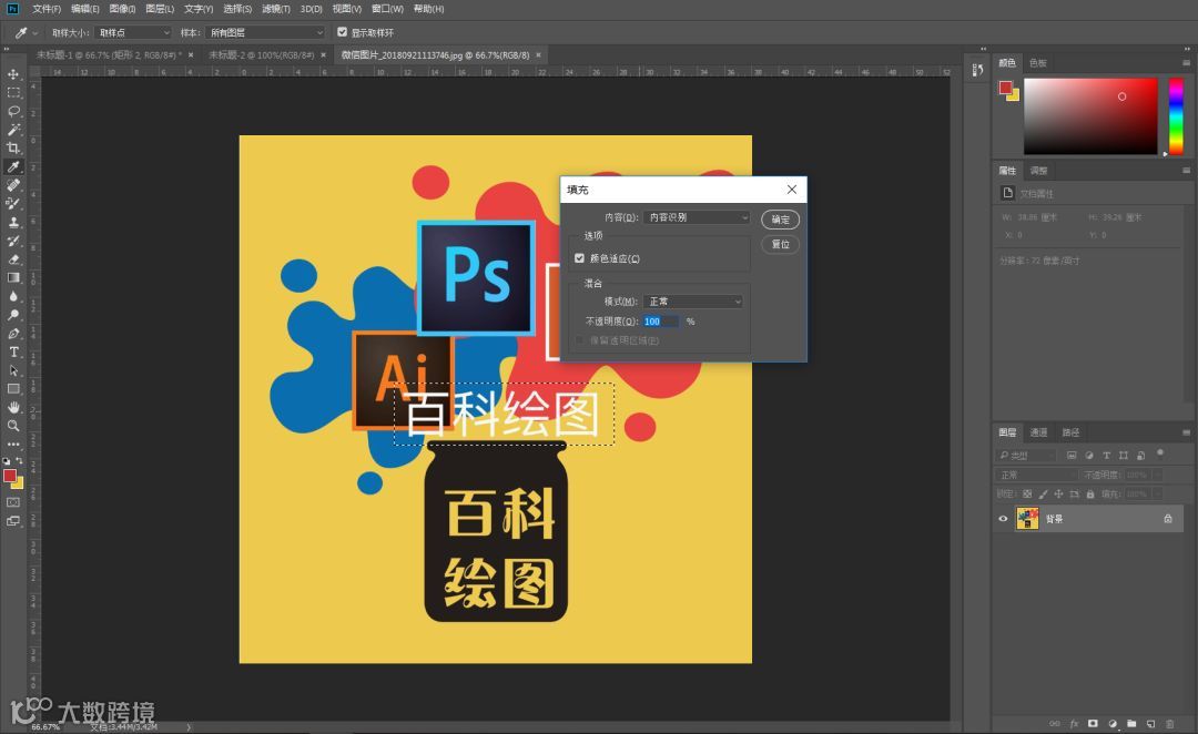 如上图所示,我们挑选一张有水印的图片,用选框工具先选中水印,然后按下Shift+F5,会出现第二张图中的选框,“内容”中选择“内容识别”,点下“确定”,水印就被去除啦~