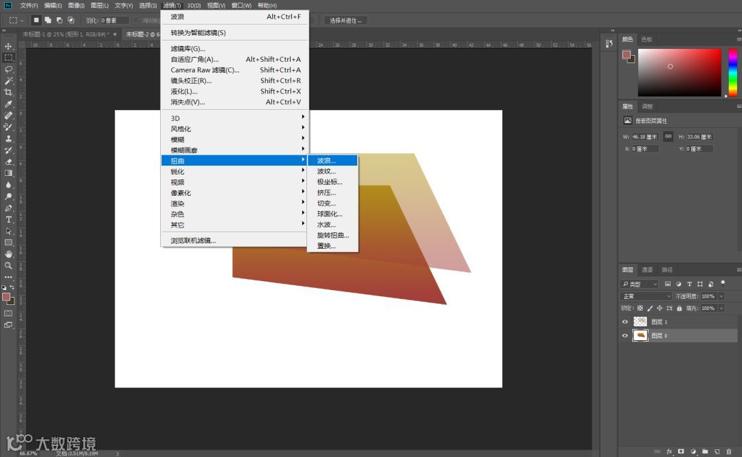 如上图所示,给图一加一个滤镜,这里选择了“扭曲”中的“波浪”,然后就能得到图二的效果。如果觉得波浪的幅度不够大,按Ctrl+F,它执行的是和上一次同样的命令以及同样参数的效果。