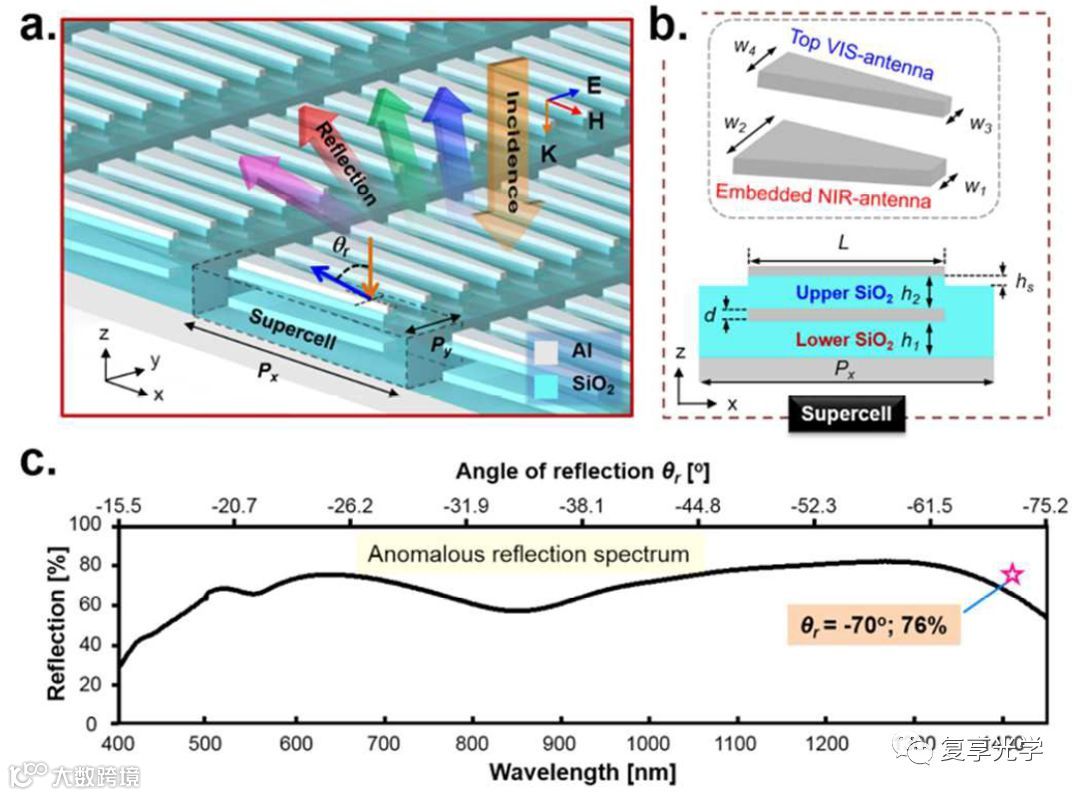 【样品 & 测试】在超表面的结构设计过程中,作者对不同的结构方案进行了反射光谱及电场强度模拟,发现同时具有 VIS-antenna 及 NIR-antenna 的超表面结构比单独具有 VIS-antenna 或 NIR-antenna 的结构表现出了更好的异常反射现象。综上,作者创造性的将两个不同梯形形状的 Al 质纳米天线, Al 基底, SiO2 介质层进行垂直级联组合,并设计尺寸为:Px = 1500nm,Py = 250nm,w1 = 90nm, w2 = 250nm, w3 = 40nm, w4 = 130nm的超表面结构。