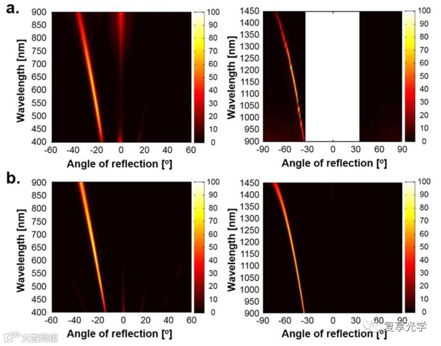 为了实验验证上述超表面结构的性能,作者采用傅里叶变换角分辨光谱法(FT-ARS)进行了小衍射角的表征,获取了±60°,400~1450nm 的衍射光谱,实现了波长及角度相关的远场强度分布表征(图3)。图3b 模拟结果与 图3a 测量结果数据吻合,证实了所设计的超表面能够获得可见到近红外的超宽带高角度衍射特性。在 440~780nm 可见波段和 964~1300nm 近红外波段,其异常反射效率均超过 50%,其反射效率峰值分别为 72%@550nm 和 72%@1150nm。