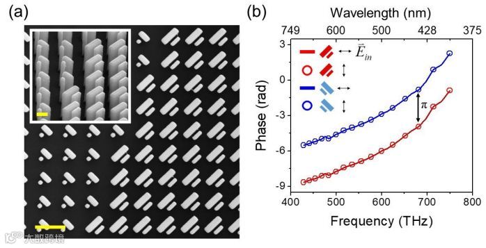 (a)在玻璃基板上由TiO2纳米鳍制成的超表面校正器部分区域的扫描显微镜图;