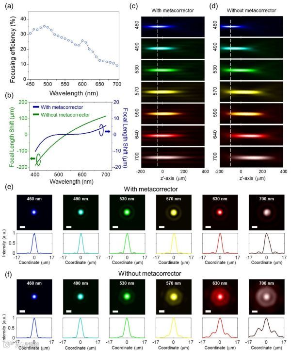 (c),(d)在使用(蓝色)和不使用(绿色)超表面校正器的情况下,在线性尺度(与它们各自波长相对应的假色)测量的强度分布;