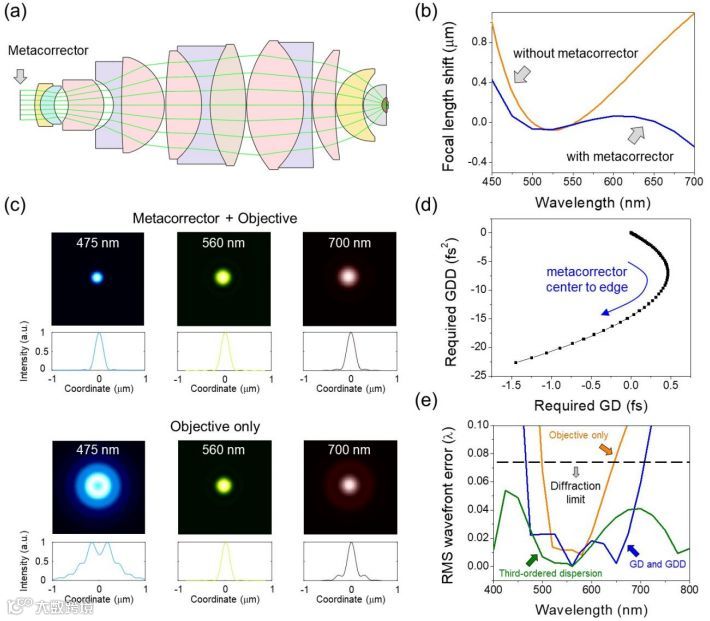 (e)考虑群延迟和群延迟色散,物镜(橙色)和具有超表面校正器(蓝色)的物镜的均方根波前像差函数。