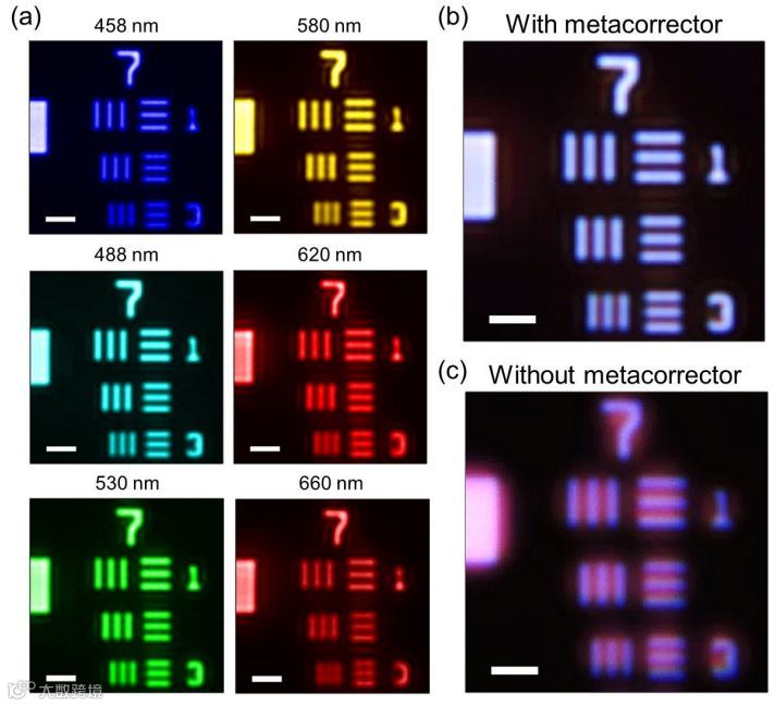 (b),(c)在超表面校正器存在和不存在(c)的情况下,白光照射下的成像比较;