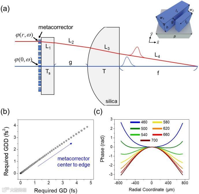 (b)从超表面校正器中心到边缘的群延迟(GD)和群延迟色散(GDD);