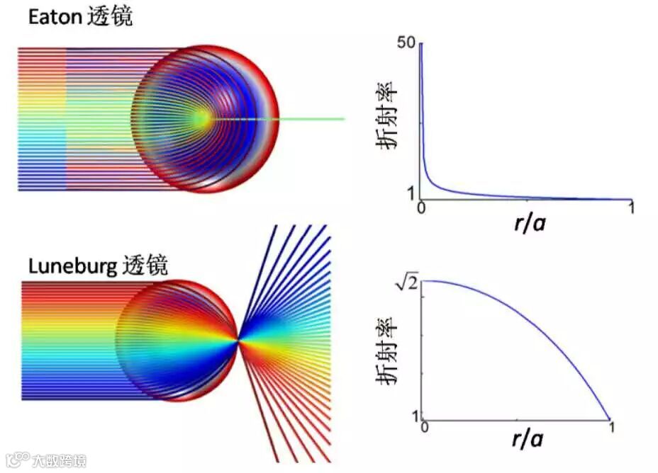 Eaton透镜和Luneburg透镜的几何光线追踪效果图和折射率分布