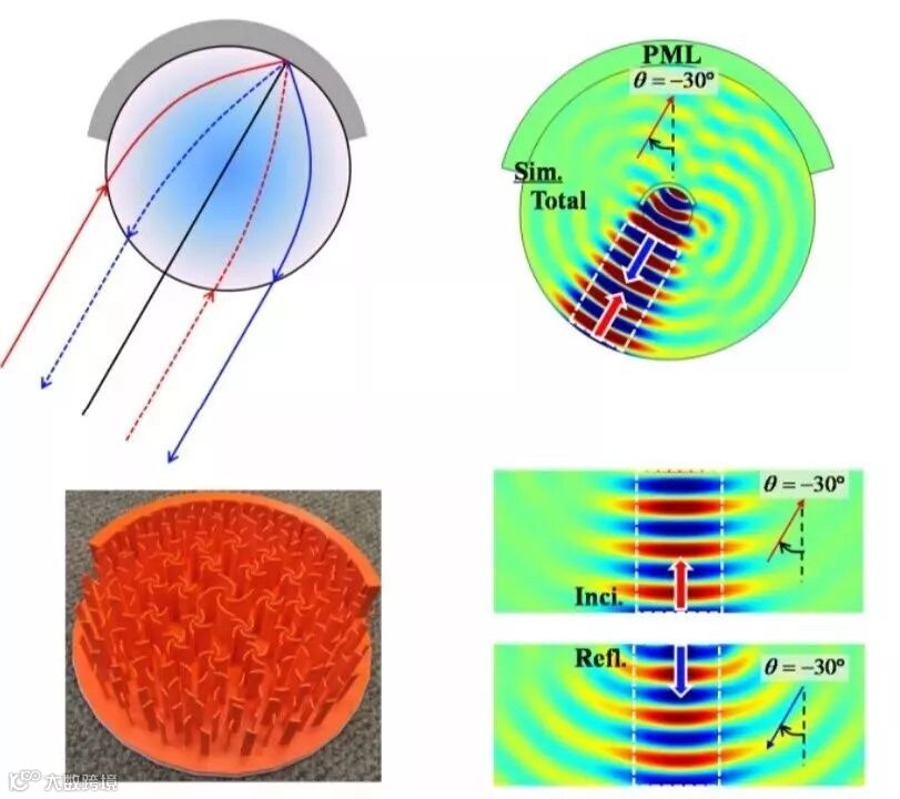 研究人员基于Luneburg透镜独特的聚焦特点,利用镜像化Luneburg透镜实现了声学回射器。该回射器很大地拓展了Luneburg透镜的功能,有效地实现了声音回射现象。该声学回射器材具有材料参数要求低、设计简单的特点,可以允许较大的入射范围以及一定的工作频宽。通过重新导向探测信号回到声源处,该回射器可以减少信号在散射过程中的损耗,从而提高传感信号的信噪比。实验表明,半径大小仅一个波长左右的该声学回射器具有120度的入射范围以及中心频率处27%左右的频宽。研究人员正在将该回射器的设计拓展到3D空间以及超声波段,这在基于脉冲反射的声学传感、通信以及探测等方面具有潜在的应用价值。