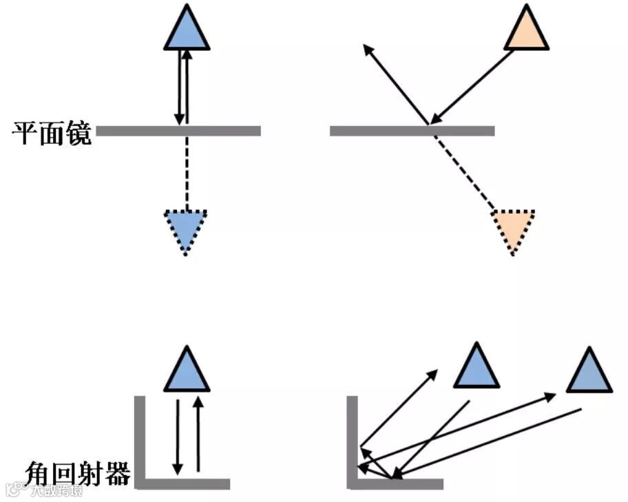 平面镜是日常生活中常见的光学物件。人在照镜子时,需要站在镜子正前方,才能从镜子中看到自己,即平面镜成像。然而,一旦人偏离了镜子的正前方,那么人向镜子看过去,便无法看到自己的像了。这是由于光线经过镜面反射,没有回到人眼处。那么,是否存在一种镜子,即使人远离镜子的正前方,也可以照见人呢?简而言之,不管光线从什么角度射来,这种镜子都能将光线沿着入射方向的反平行方向反射回去。这种镜子被称为回射器(Retroreflector)。回射器是一种体状或者表面结构,可以将入射波重新定向反射回波源处。最简单的回射器是角回射器,只需将两个平面镜垂直放置,利用多次镜面反射,可以实现光线回射。人只要站在直角所在的区域中(90º 的照射范围),都可以看到自己的像。人一旦离开角锥区域,回射现象便消失。
