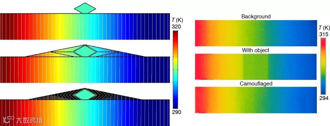 图3. 左,数值模拟得到的系统温度分布侧视图。由上而下依次为:背景上放置一物体;物体被伪装(超材料采用理想参数);物体被伪装(超材料采用实际样品结构及参数)。右,实验中红外拍摄得到的温度分布俯视图。由上而下以此为:纯背景;背景上放置一物体;物体被伪装。