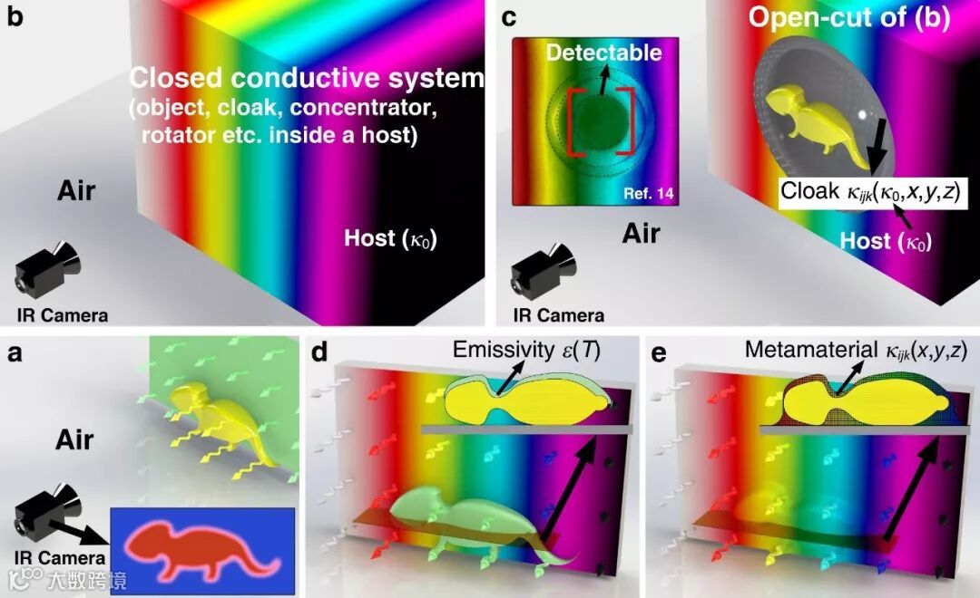 变换热学借鉴于变换光学,是近年来传热研究中蓬勃发展的一个研究领域[1]。变换热学理论巧妙地运用空间变换作为基础,可以实现对热传导温度场的精确调控。基于该理论,众多新奇的热超材料被设计制造出来,广泛应用于热能收集、保温和定向热输运等。尽管如此,目前的热超材料仍无法针对热辐射做出有效的控制。这一现象的主要原因在于,热辐射与物体表面温度紧密相关,其借助电磁波传播 而非热导体,这就与热超材料的应用场景有着本质上的差异。除此之外,传统变换热学理论要求占用一部分背景材料用于做空间变换,而热辐射伪装中对物体背景环境(如地面等)进行改造是不切实际的(图1b-c)。另一方面,针对红外探测,近年来已有一些利用低发射率材料覆盖物体表面的尝试[2],但这种方法还不能应对更一般的情况:一旦环境中存在其他热源,导致温度不均匀,物体还是会暴露于红外探测之下(图1d)。