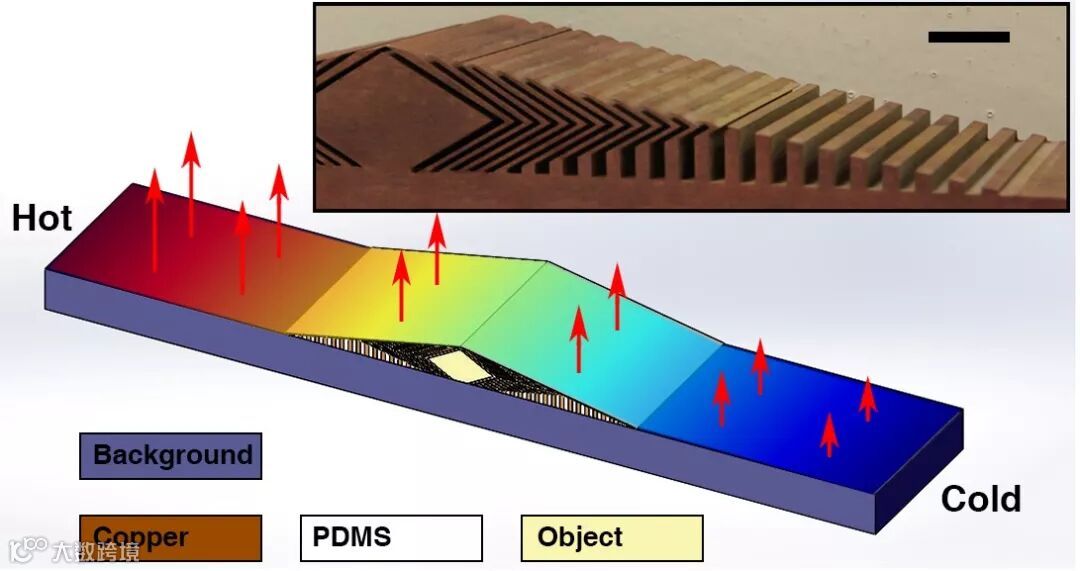 研究人员通过实验成功制备了这种表面热超材料(图2)并实际验证了上述理论。如图3所示,当在背景上放置某一物体时,通过红外成像技术研究者可以很轻易地观测到物体的形状和位置;但是,当物体上方被表面热超材料覆盖后,仅凭借红外成像已无法辨别整个系统与单纯背景的差异,尽管此时的背景中仍存在着不均匀的温度分布。实验结果和数值模拟还发现,无论哪种背景材料,运用同一设备都能起到很好的伪装效果,这再次证明了研究方法的广泛适用性和鲁棒性。