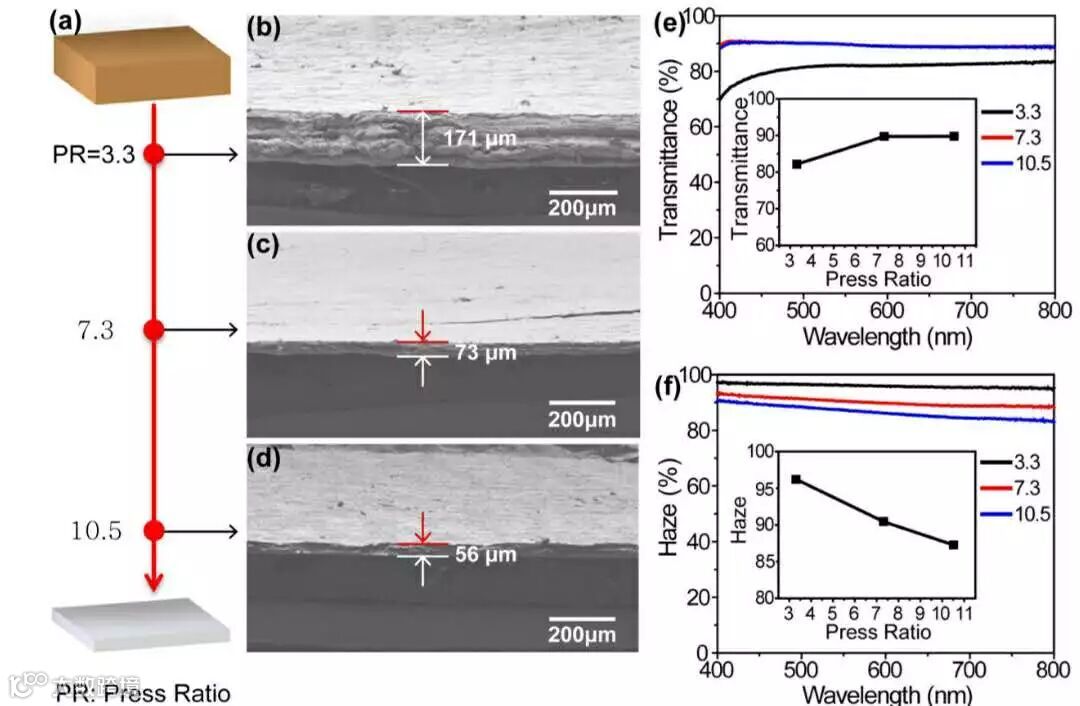 e, 各个压缩比情况下透明纸的透射光谱,总的透射率随着压缩比的增大而增大,但是在压缩比达到7.3之后,透射率的变化就会很小;