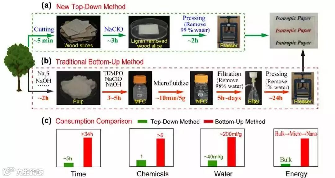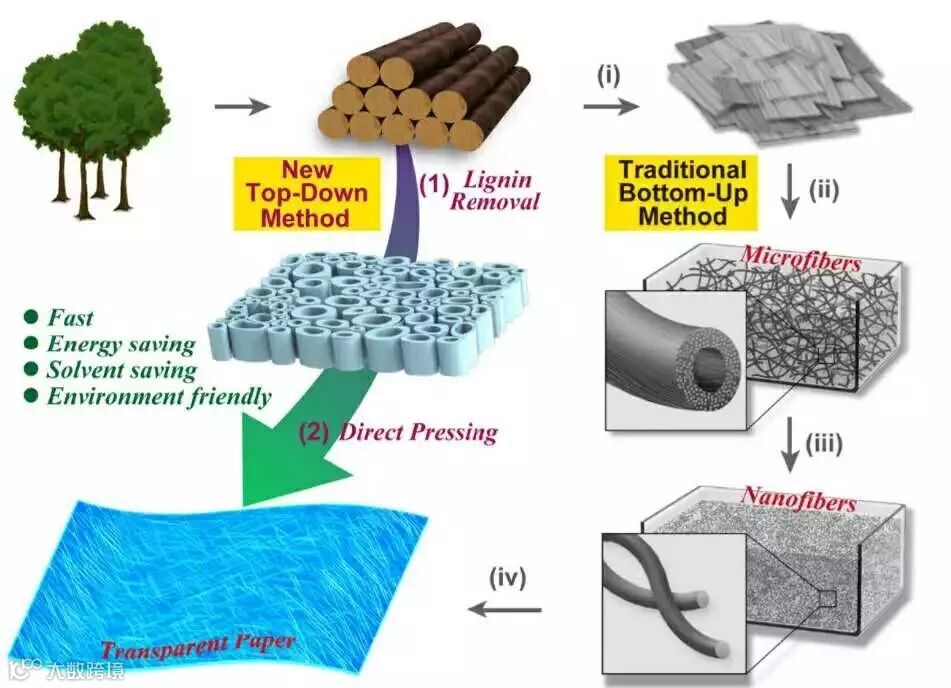 传统的制备“透明纸”的方法是一种“自下而上”(Bottom Up)的制备方法,它主要包括两步:首先利用机械或者化学的方法将纤维素纤维从木材中分离出来,得到微米纤维素纤维;再通过多道处理,形成纤维素纳米纤维网络。这种自下而上制备透明纸的方法最为关键的是将微米级的纤维素纤维分离成纳米级的纤维素纤维,以消除纤维素纤维对光的散射作用,从而实现透明效果。但是纳米纤维素纤维的分离、漂洗、浓缩工艺将消耗大量的水、时间和能量,使得这种自下而上的方法低效、昂贵以及环境不友好。