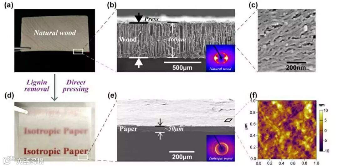 b, e中插入的XRD图案显示了原始木材的各向异性和透明纸的各向同性。