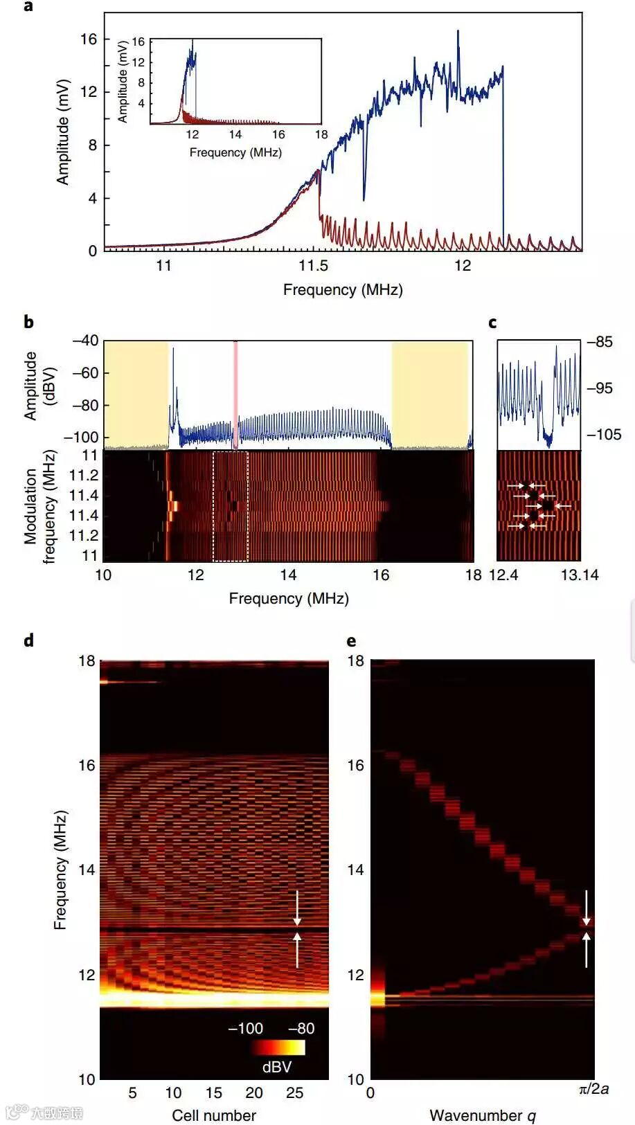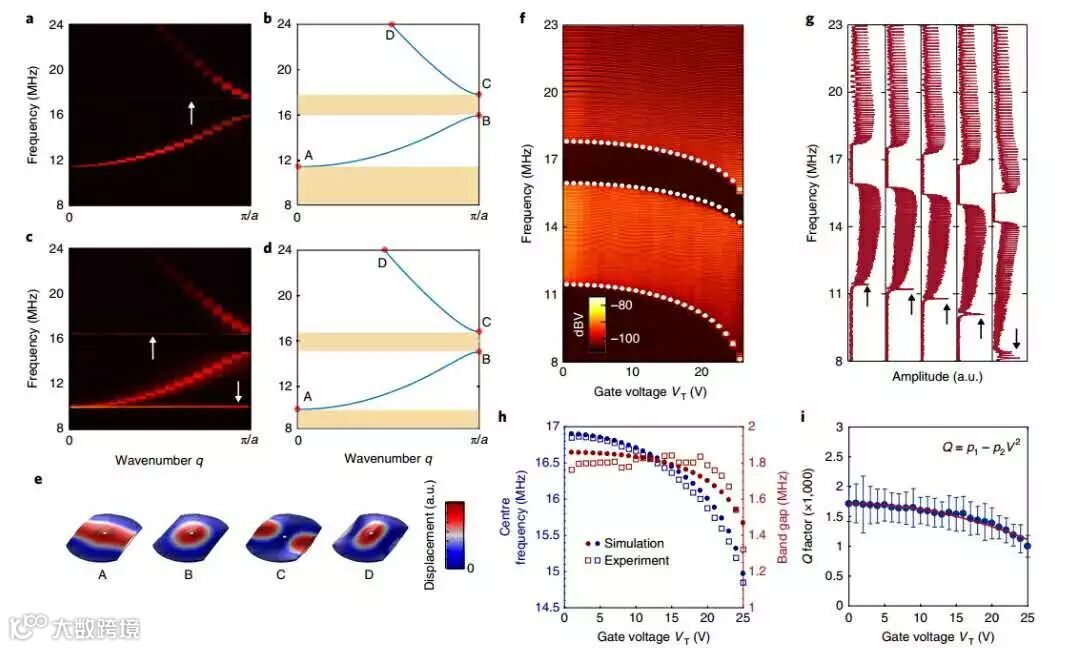 e, 与图d中扫面数据对应的频率色散曲线;图c–e白色箭头标出的是诱发的带隙。