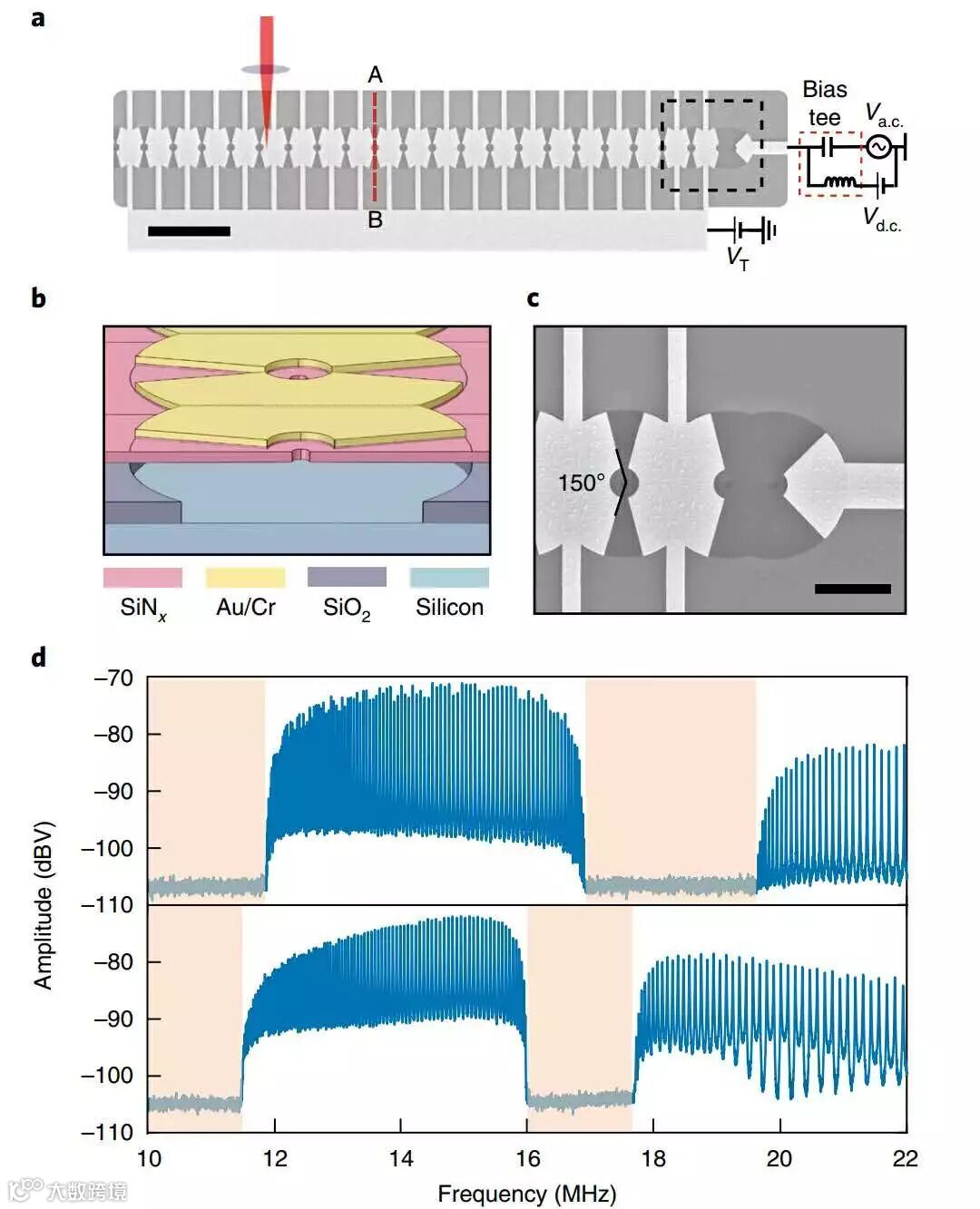 美国加州理工学院Chiara Daraio教授和Jinwoong Cha博士后设计了一种一维非线性纳米机电晶格(nanoelectromechanical lattices ,NEML),在频率10-30 MHz范围内实现了对声子色散关系的动态电压调制,同时触发了非线性效应、导致声子带隙发生显著的偏移,这种现象类似于凝聚态物理中的Peierls相变。相关工作以“Electrical tuning of elastic wave propagationin nanomechanical lattices at MHz frequencies”为题,发表在《Nature Nanotechnology》期刊上。