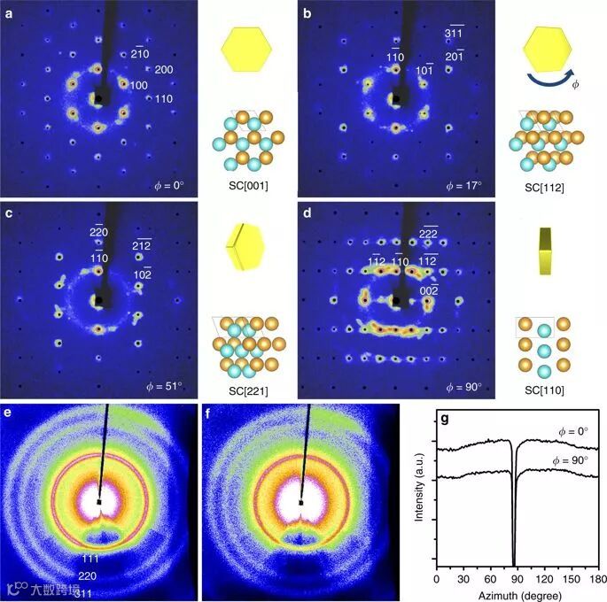 e-f 分别为图a、d所示晶面面下的广角X射线散射图谱