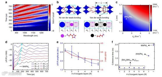 作为对比,作者在另一种没有范德瓦耳斯键存在的2D杂化钙钛矿材料(HA)PbI4中进行了对照实验,实验得到的(HA)PbI4层间声速为1939m s-1,结合相应的模型修正,作者证明了范德瓦耳斯键的存在确实显著地降低了相干声子速度。