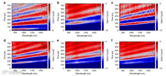 为了获得样品的声速,需要预先测量样品在不同波长下的折射率n。可以发现:随着n的增加,折射率呈现单调递增的趋势。利用这一数据,研究人员计算得到了2D RPs系列样品的声速。可以发现,与体块MAPbI3的声速(2340-2990m s-1)相比,2D RPs具有更低的层间声速(1432m-1637m s-1);并且,随着无机层层数N的减少,声速大致呈现下降的趋势。