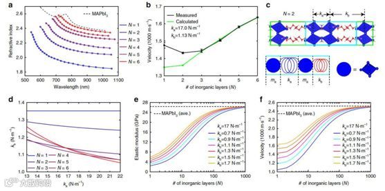 图3 (a)2DRPs带隙以下区间折射率曲线;(b)2D RPs声速测量结果与理论对比图;(c)简易弹簧振子模型示意图;(d)理论结算与实验符合的弹性常数组合示意图;(e)利用优化参数模拟2D RPs层间弹性模量随无机层数变化示意图;(f)利用优化参数模拟2D RPs层间声速随无机层数变化示意图。