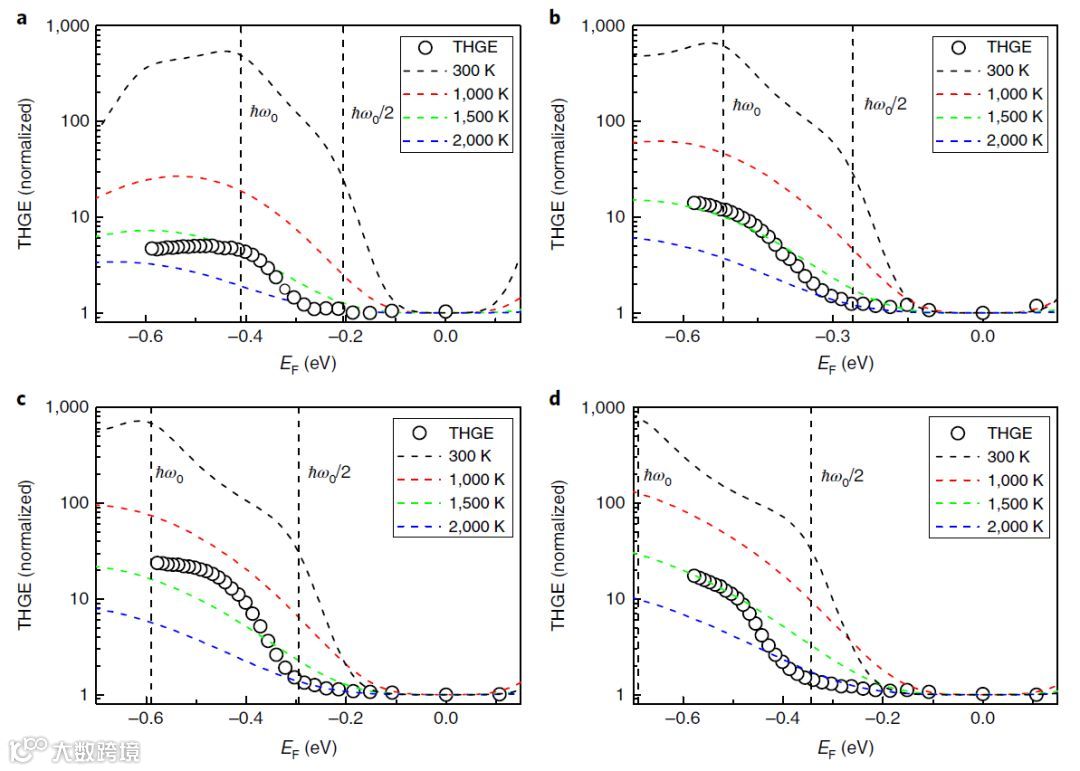 通过对不同波长入射光所产生的THG信号的分析,发现当入射光子能量从0.7 eV下降至0.4 eV后,THG信号得到了约75倍的增强(图7a & b),这主要与费米能EF以及对应的电子温度Te有关,光电子跃迁机制可以较好地解释这一现象。此外,他们通过调节器件的背栅电压,实现了对费米能的调节,进而观测到THG效应与费米能的依赖关系(图7c & d)。通过细致地调节费米能的位置,可以在EF=-0.6 eV附近实现THG信号20倍的增强。进一步更为细致的研究发现,三阶非线性响应的效率与入射光光强的平方成正比,因此不同情形下得到的THG效率与平均功率、光斑大小、脉冲宽度等诸多因素有关,不同实验间效率值是往往具有不可重复性。