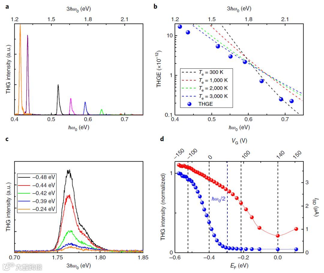 图7、a.蓝宝石衬底上石墨烯的THG信号,入射光能量为~0.4-0.7 eV;b.蓝宝石上石墨烯的THG信号与入射光能量的依赖关系;c.不同费米能EF对应下的三阶非线性光学响应信号;d.石墨烯场效应器件的THG信号以及源-漏电流与栅极电压的依赖关系。
