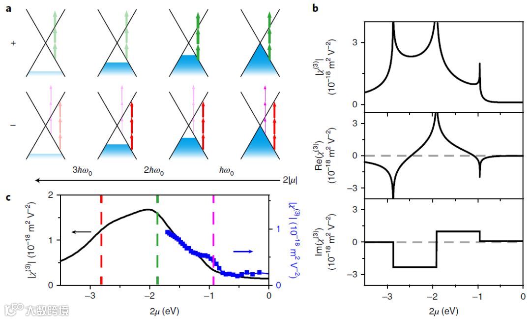 图4、a.电场调节化学势μ对非线性电子跃迁机制的影响示意图;b.三阶非线性磁化率与化学势依赖关系的理论计算结果;c.实验数据(蓝点)与理论计算结果(黑线)的对比图。