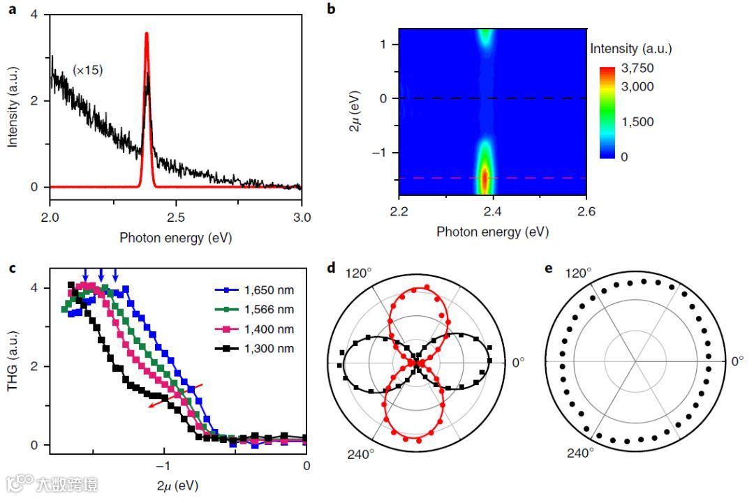 图2、a.飞秒脉冲激光垂直入射后的三次谐波THG测量信号;b.不同化学势μ和光子能量下的THG信号强度;c.不同激发光波长入射时,THG信号与化学势μ的关系;d & e. THG信号随入射光线性偏振与器件特征方向角的极坐标图。