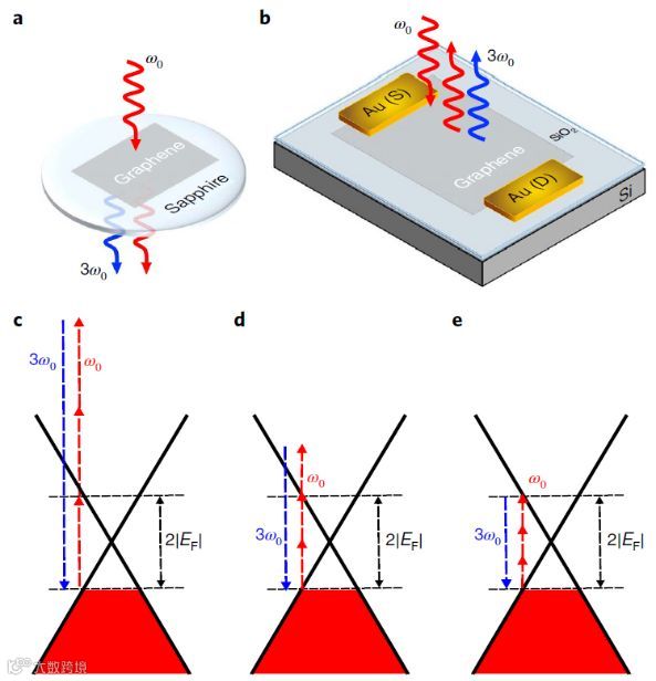 恰巧在同一天,来自剑桥大学的Andrea C. Ferrari教授领衔的研究团队、意大利技术研究院、米兰理工大学等科研单位,利用背栅电压调制技术实现了石墨烯三阶非线性效应的宽光谱电场可调,通过控制石墨烯费米面和入射光子的能量,实现了两个数量级的效率增强,并将其归因于共振型多光子跃迁(resonant multiphoton transition)。研究成果以“Broadband, electrically tunable third-harmonic generation in graphene”为题在Nature Nanotechnology上on-line发表。