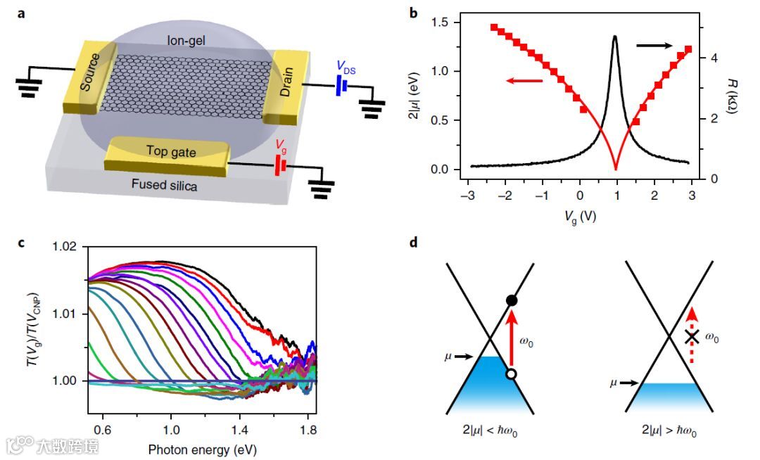 图1、a.基于离子凝胶调控技术的石墨烯场效应晶体管器件示意图;b.石墨烯电阻与栅电压Vg的测量曲线;c.不同栅电压调制下的石墨烯透射光谱;d.石墨烯线性能带中的带间光电子跃迁示意图。