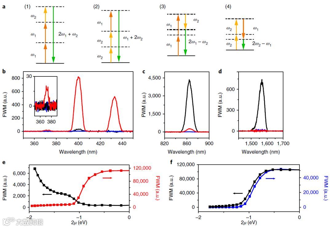 图3、a.四波混频电子跃迁过程示意图;b. 433 nm处的3ω2、400 nm处的ω1+2ω2以及371 nm处的2ω1+ω2过程所对应的四波混频光谱;c. 867 nm处的2ω1−ω2过程以及d. 1566 nm处的2ω2−ω1过程;e. ω1+2ω2 (黑色) 以及2ω1−ω2 (红色)过程产生的四波混频信号与2μ的依赖关系;f. 2ω1−ω2 (黑色)与2ω2−ω1 (蓝色)过程产生的四波混频信号与2μ的依赖关系。