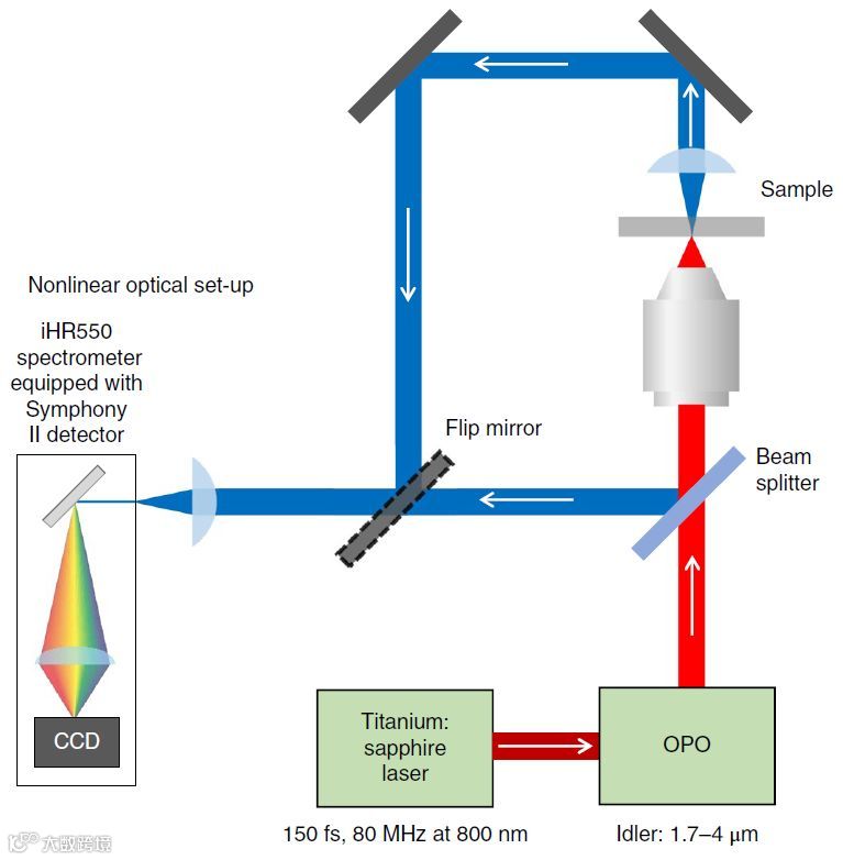 为了研究石墨烯器件的三阶非线性光学响应,研究人员搭建了如图6所示的超快光谱分析系统。光源采用波长800nm、脉冲宽度为150飞秒、重复频率80MHz的飞秒脉冲激光器,经光学参量振荡器(OPO)后产生波长为1.7-4微米的宽谱可调谐红外激光,从而确保了能在0.4–0.7 eV对应能量的光谱范围内研究石墨烯的宽谱非线性特性。