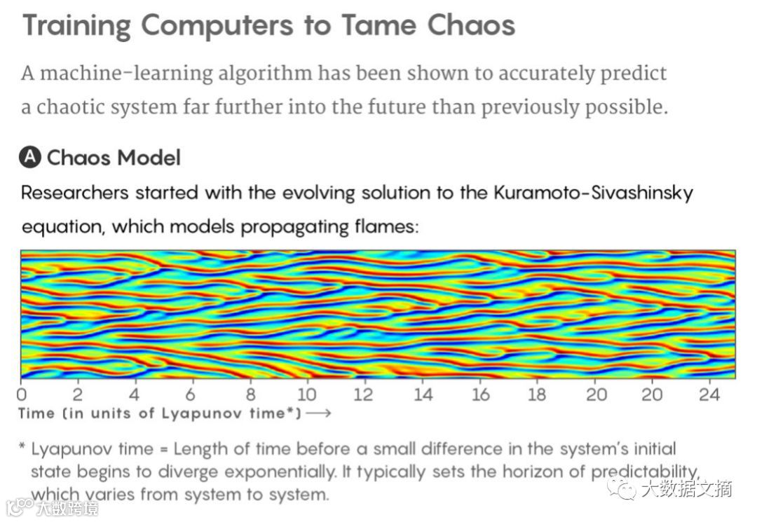 在用Kuramoto-Sivashinsky方程的演进数据进行训练后,计算机算法可以近似地预测火焰系统在未来八个李亚普诺夫时间(Lyapunov times)长度的演进。李亚普诺夫时间表示混沌系统的两个几乎完全相同的状态需要多长时间才能呈指数发散。