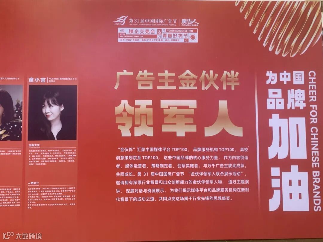 为中国品牌加油!第 31 届中国国际广告节 “金伙伴领军人物联合展示活动”,邀请拥有深厚行业背景和出众创新能力的金伙伴领军人物,共同点亮这场属于行业先锋的思想盛宴。MUSINESS商用版权音乐平台董事长 童小言女士,有幸获称“广告主金伙伴领军人物”以及“2024当代杰出广告人”。
