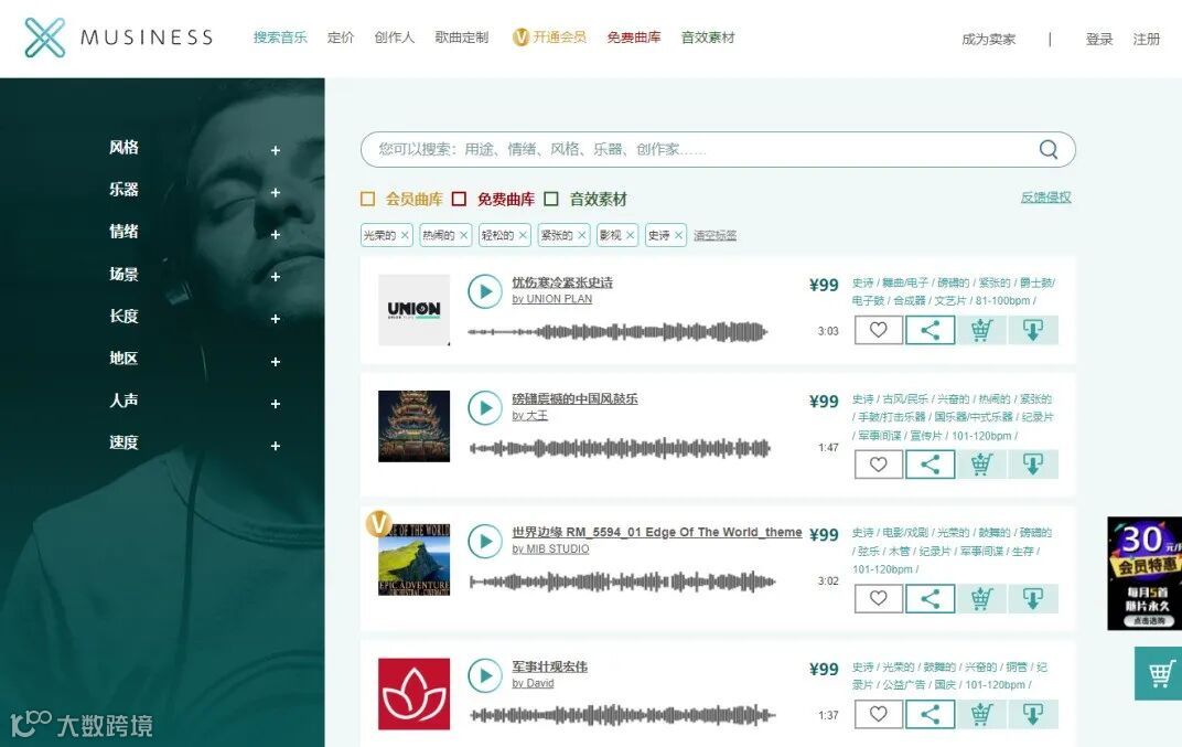 MUSINESS音乐素材网(www.musiness.vip),聚合了约300,000首优质大牌音乐、配乐、音效曲库及配音cv声展区,含数百位好莱坞音乐制作人作品,是世界经典名曲《班得瑞》全部15张专辑在中国大陆地区的独家授权代理。广告配乐、短视频背景音乐、元宇宙空间环境音乐、影视配乐、游戏BGM、动漫BGM等需求均可在MUSINESS音乐素材网中依据标签和关键词搜索下载,并获得音乐授权使用证书。MUSINESS音乐素材网开放了部分免费音乐曲库,让用户尽情享受正版音乐商用的自由。2022年度广告门指数代理公司年度TOP100、设计制作代理公司TOP10、蝉联2022及2023年度中国国际广告节-广告主金伙伴百强企业。
