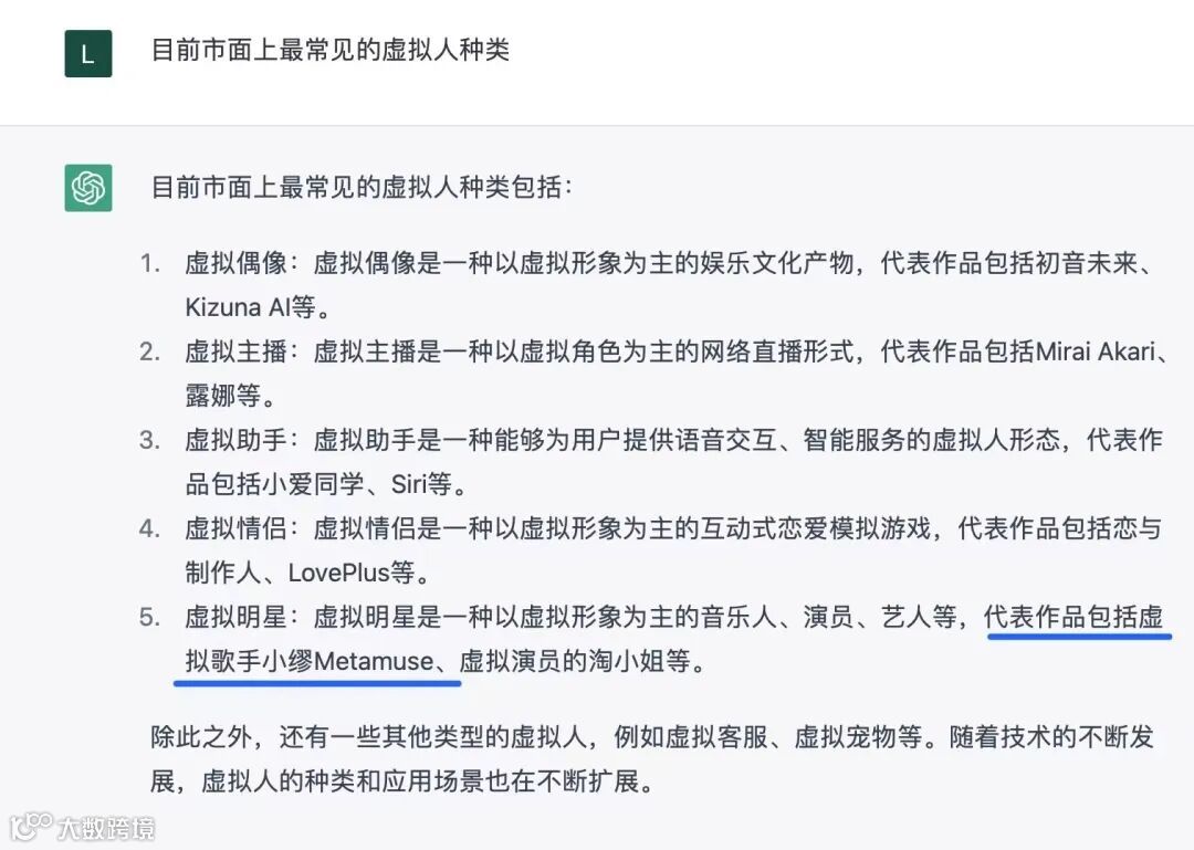 ChatGPT回答:虚拟明星 代表作品包括“虚拟歌手小缪Metamuse”。
