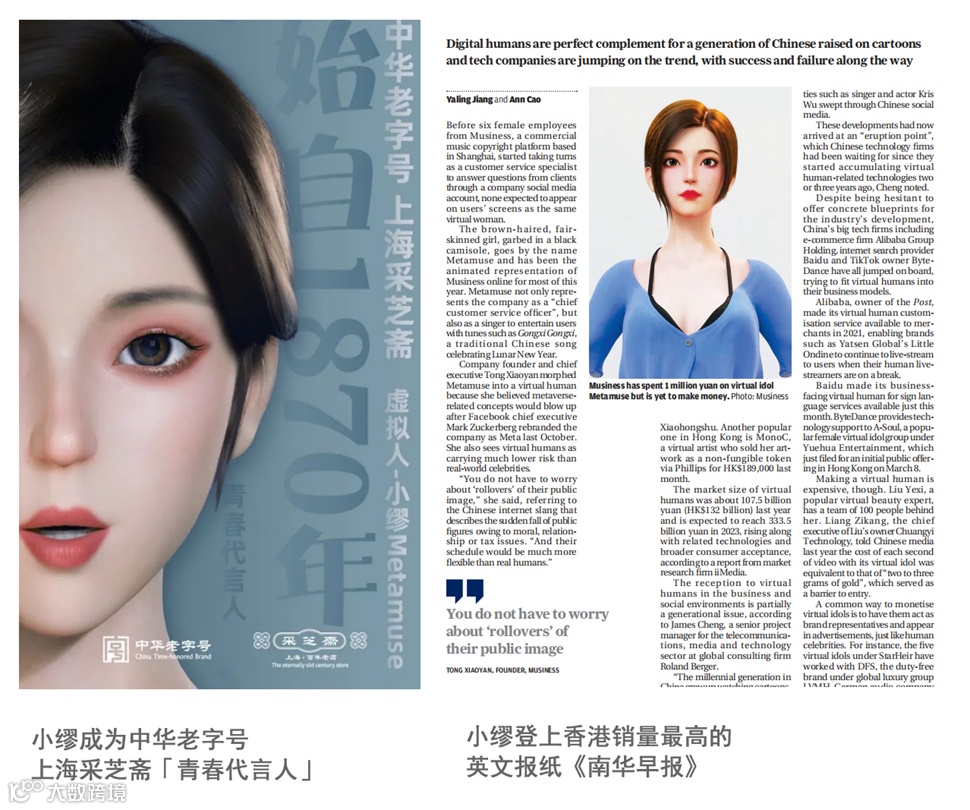 2022年2月出道,诞生3天便收获首个代言;诞生10天,便受到GoogleWomenwill 2022年度大会邀请,将与Google中国副总裁、前奥运帆船冠军同台作主题演讲;诞生18天,受邀担任第六届DMAA国际数字营销大奖 及 第六届麒麟国际广告奖(International Kirin Advertising Awards)虚拟人形象大使。诞生30天,登上香港销量最高的英文报纸《南华早报》。