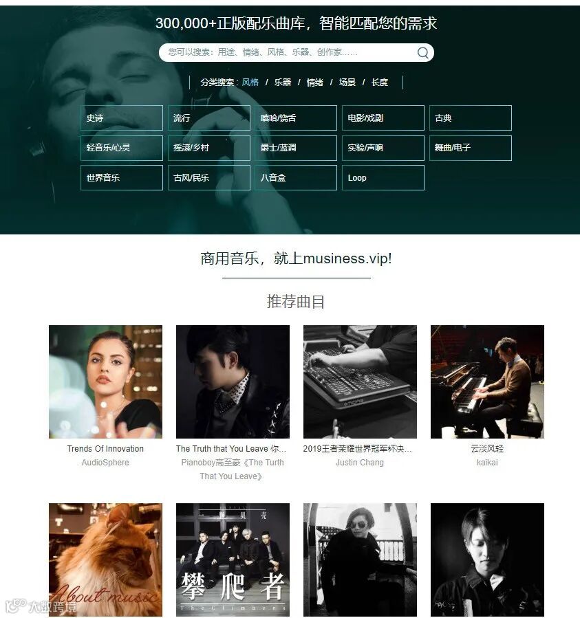MUSINESS专注正版音乐的授权与交易,营造中国良好的音乐版权意识及交易环境。MUSINESS正版音乐素材平台,聚合了约300,000万首大牌音乐、配乐、音效曲库。MUSINESS = MUSIC + BUSINESS