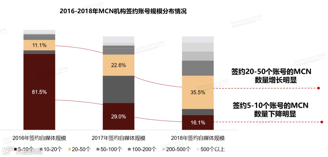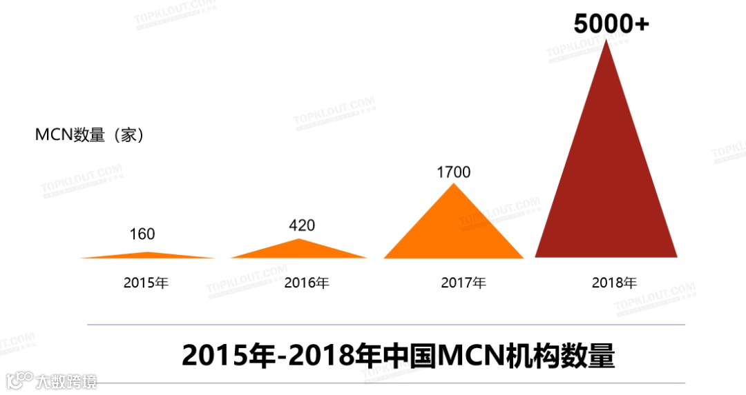 根据QuestMobile发布的《中国移动互联网2019春季报告》显示,2019年一季度,全国短视频用户已达到8亿;而克劳锐指数研究院发布的《2019中国MCN行业发展研究白皮书》表明,2016年中国MCN机构数量为420家,2017年达到1700家,在2018年底,中国MCN市机构数量已达到5000+家。而2019年仍然会是MCN机构数不断增加的一年,结合近3年数据显示,MCN机构签约账号个数也在逐年增长。