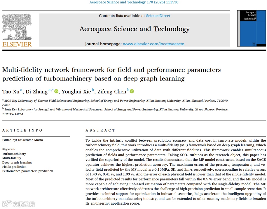 标题:Multi-fidelity Network Framework for Field and Performance Parameters Prediction of Turbomachinery Based on Deep Graph Learning -
