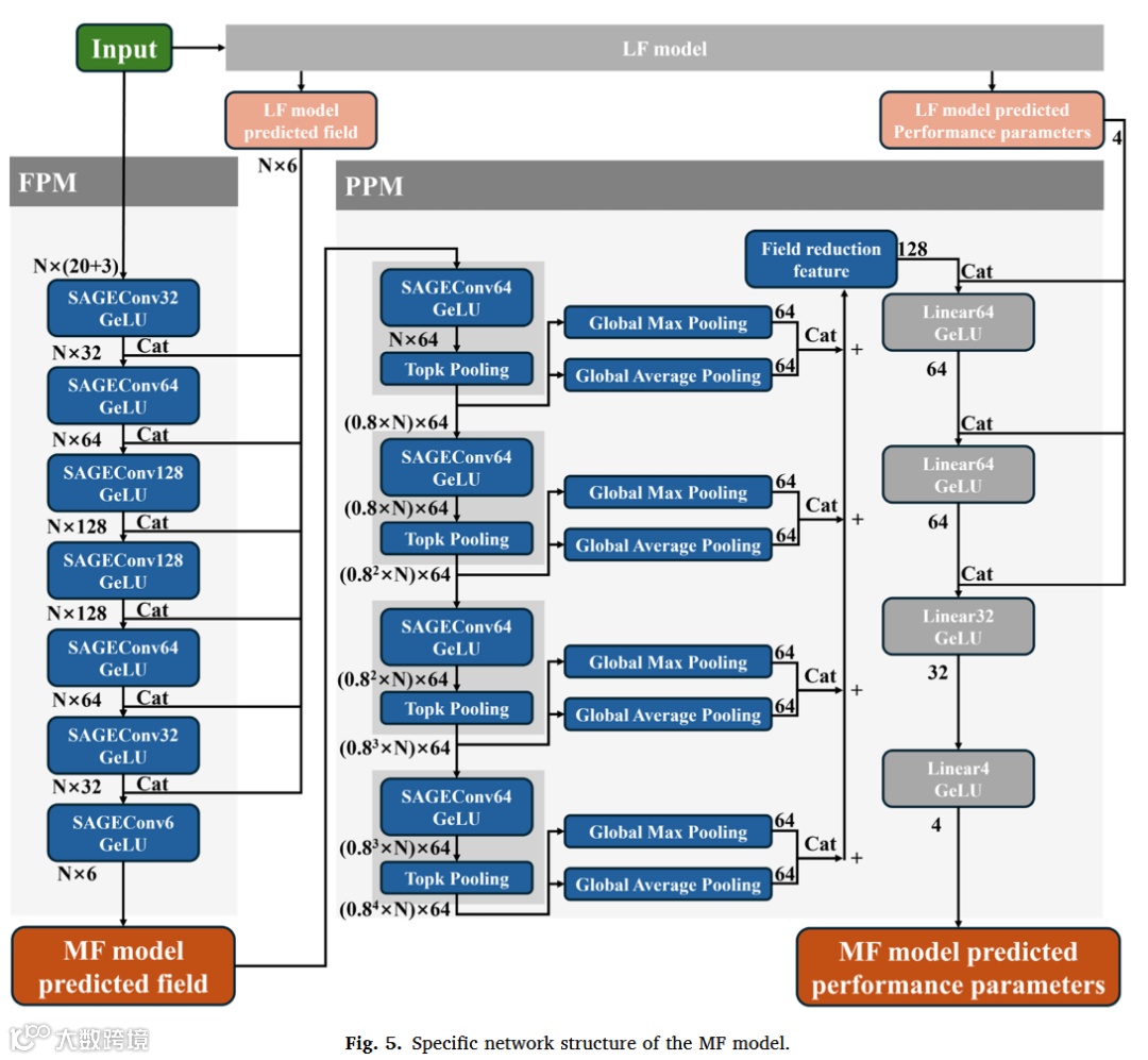 场预测网络(FPN):7层SAGE图卷积融合空间坐标 、设计变量 及LF预测 ; -