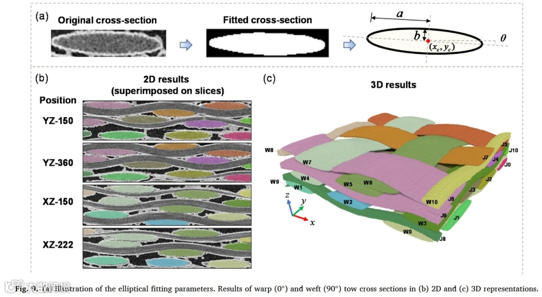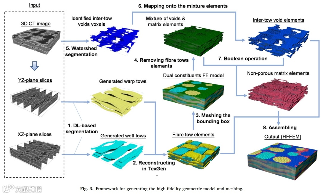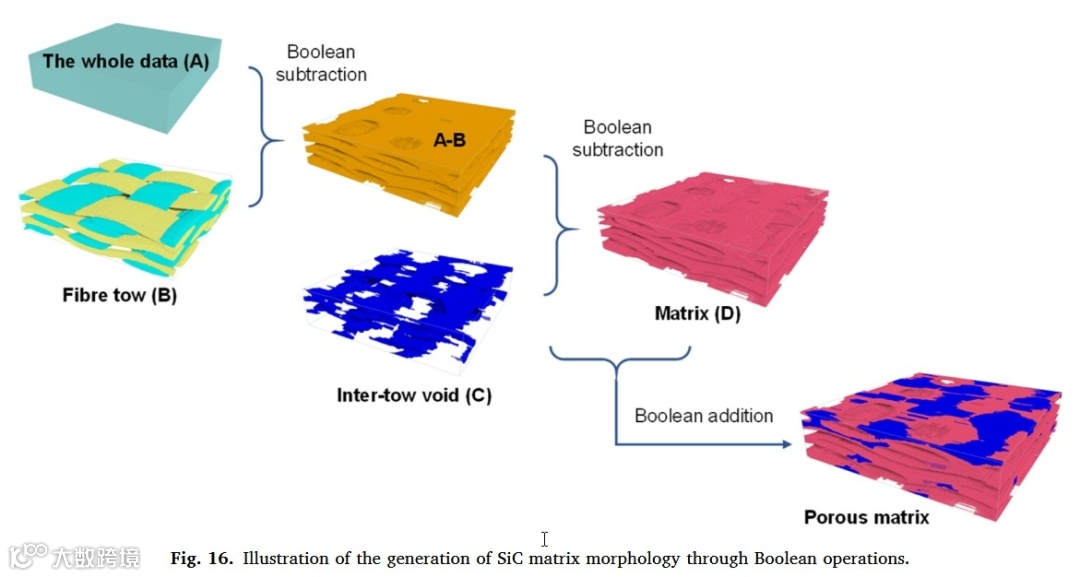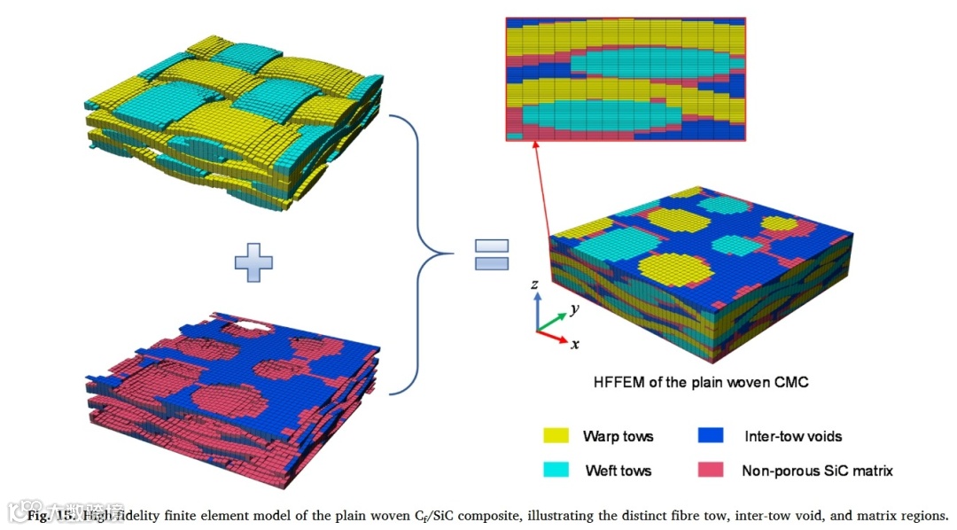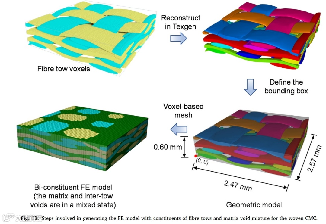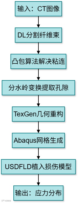 本文提出了一种基于图像的机织CMC高保真有限元建模方法。通过高分辨率CT扫描,采用深度学习分割纤维束,开发凸包算法处理交叉粘连,利用分水岭变换识别孔隙。模型结合渐进损伤本构,预测应力-应变曲线与实验高度吻合。