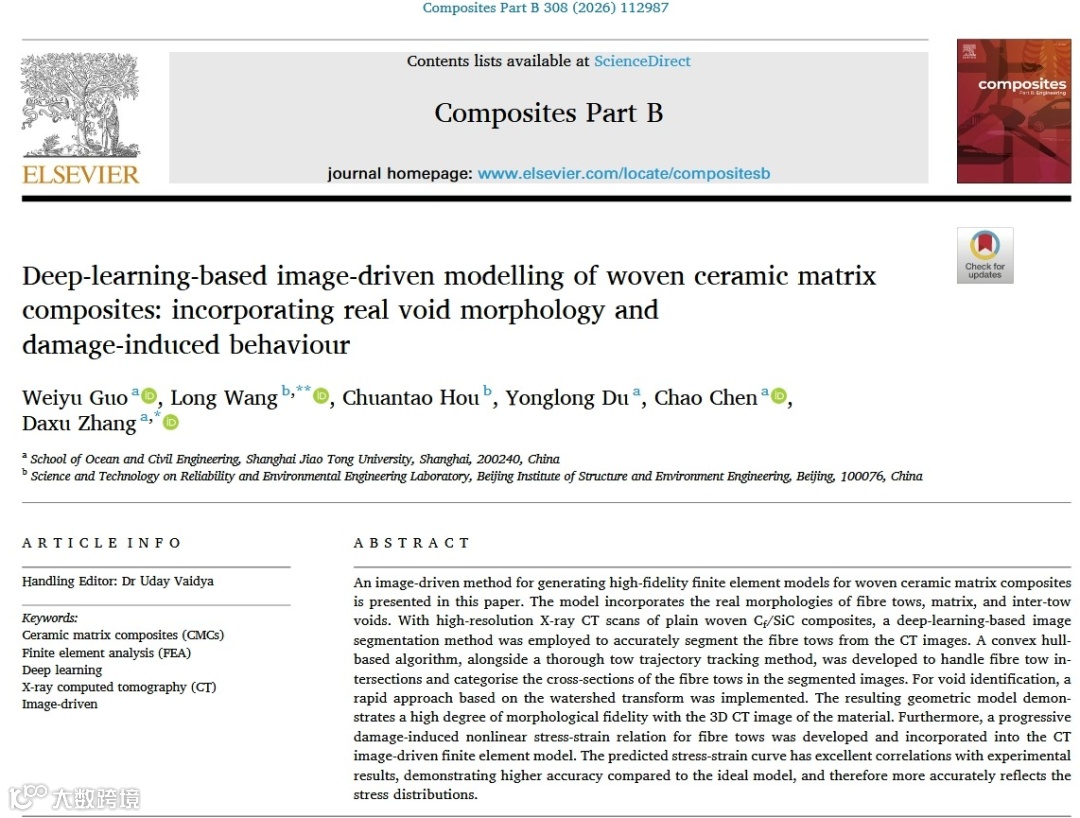 这篇论文发现了一个关于机织陶瓷基复合材料(CMCs)中真实孔隙形态对力学行为影响的真问题。该问题的核心硬挑战在于现有理想化模型无法准确表征真实孔隙和损伤演化。为了攻克这一挑战,作者提出了基于深度学习和分水岭变换的孔隙集成有限元建模方法的巧方法。该方法取得了关键组分物体积分数误差 < 3.2%且应力预测精度显著提升的强效果,最终为我们带来了“孔隙形态调控载荷再分布” 的新见解。