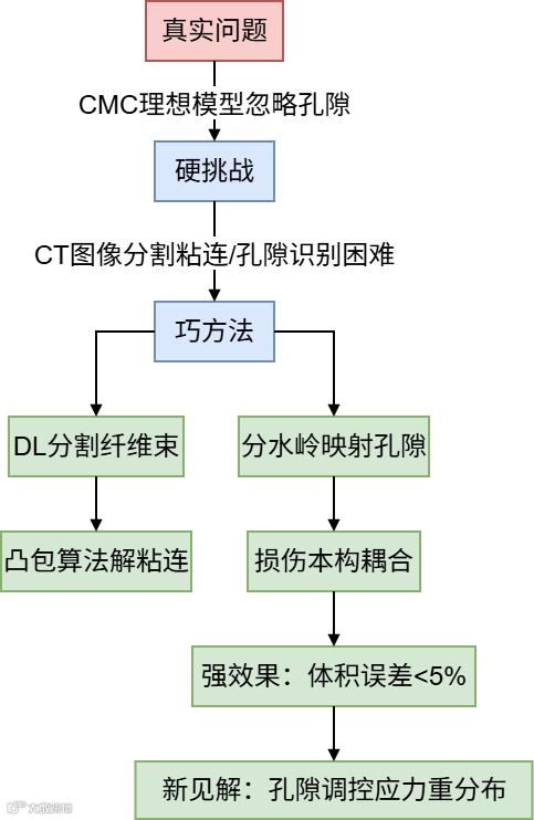 • 孔隙非均匀性是应力重分布的“隐形工程师”:真实孔隙导致纤维束交界处应力集中,诱发裂纹萌生; -