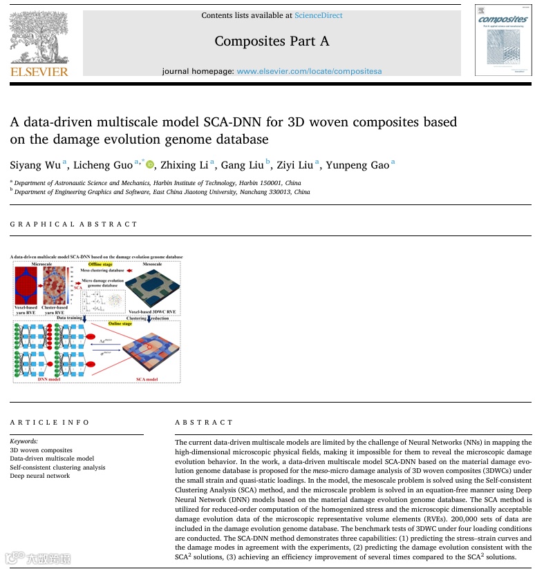 该论文发现了一个关于三维编织复合材料(3DWC)多尺度损伤演化高效预测的真问题。该问题的核心硬挑战在于现有数据驱动多尺度模型无法捕获微观高维损伤场。为攻克此挑战,作者提出了基于自洽聚类分析(SCA)的损伤基因组压缩与深度神经网络(DNN)耦合的SCA-DNN框架。该方法取得了与实验吻合的应力-应变曲线预测及微观损伤演化重构的强效果,最终凝练出"微观物理场维度压缩是AI驱动材料损伤建模的关键"的新见解。
