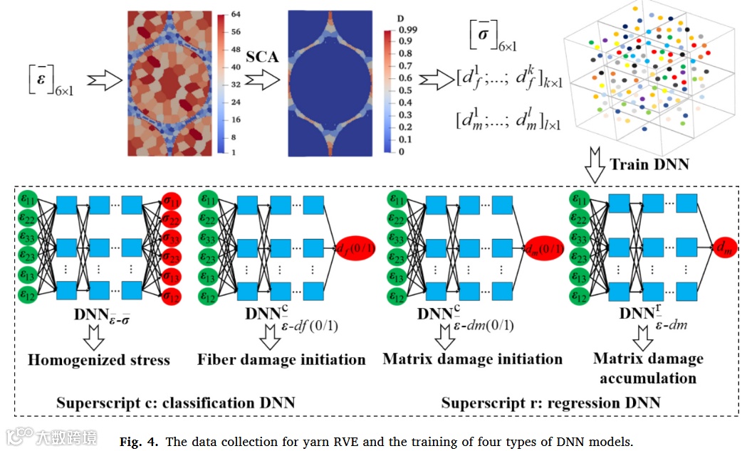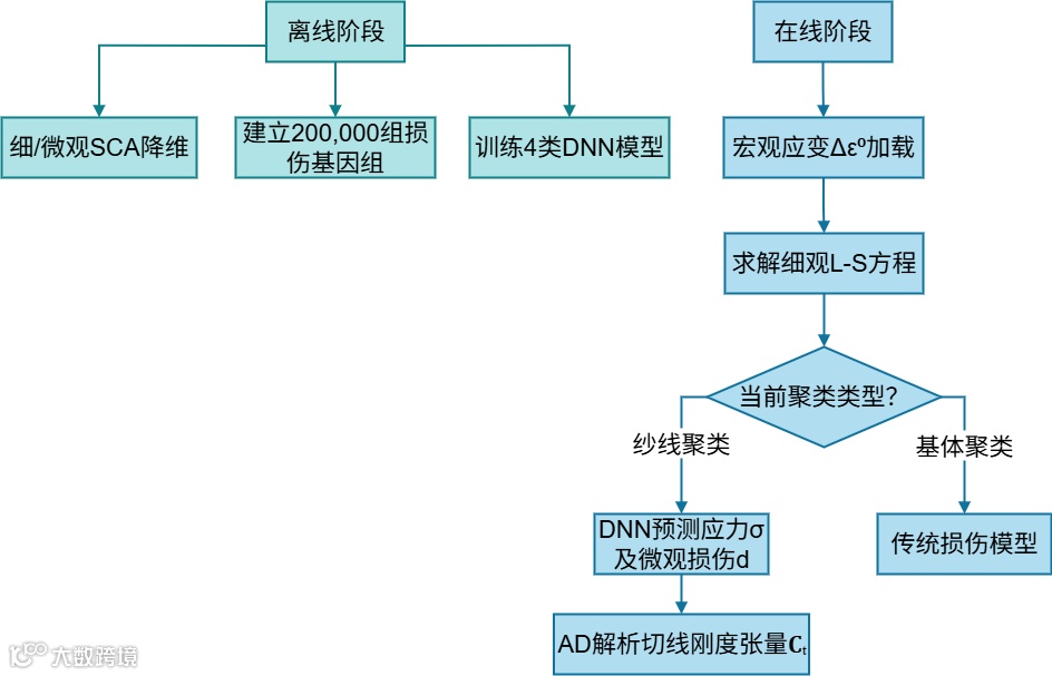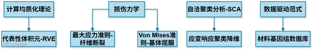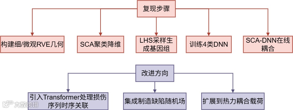 1️⃣ 用SCA将微观代表体积元(RVE)压缩为聚类场(10⁴→10¹维度) 2️⃣ 建立四类DNN模型: - DNNᵉ̄‑ᵒ̄:均质化应力预测- DNNᵉ̄‑ᵈᶠ⁽⁰∕¹⁾:纤维损伤状态分类- DNNᵉ̄‑ᵈᵐ⁽⁰∕¹⁾ & DNNᵉ̄‑ᵈᵐ:基体损伤演化回归3️⃣ 在线阶段:DNN实时替换微观求解器,首次实现微观损伤场的间接重构。 |